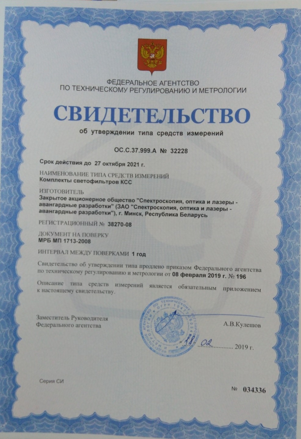 Комплект светофильтров КСС зарегистрирован в Государственном реестре средств измерений, имеет сертификат об утверждении типа средств измерений № 10698.
